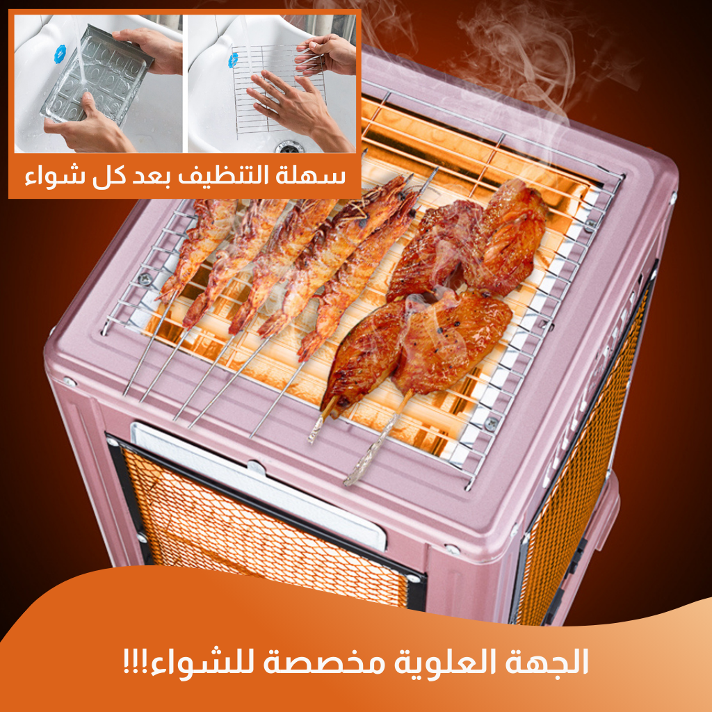تتميز المدفأة بخمس واجهات، مما يسمح بانتشار الحرارة بشكل متساوٍ كما تتضمن أيضًا منصة متكاملة للشواء في الجزء العلوي.